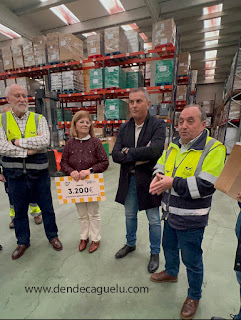 Para seguidamente desplazarse hasta el cercano polígono, donde eran esperados por tres de los voluntarios de la Fundación: Pepa Peña, Juanjo Cima y Agripino Rodríguez, vicepresidenta, secretario y responsable de almacén respectivamente, a los que entregaron el importe obtenido de la subasta.