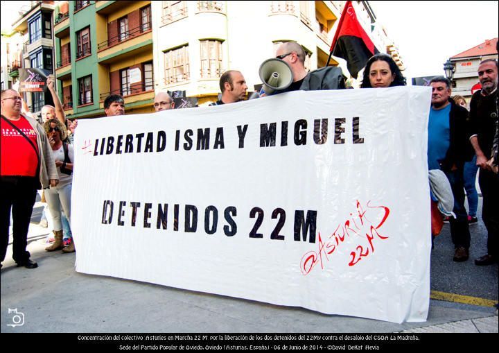 Concentración de 'Asturies en Marcha 22M', convocada para hoy a las 19:30 en frente de la Sede del Partido Popular de Oviedo. En ella se pedíala liberación de los jóvenes detenidos en las marchas del 22M así como la cancelación del deshaucio del CSOA La Mdreña de Oviedo.