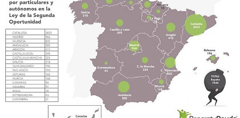 En la Comunidad de Asturias son más de 165 las personas en situación de sobre endeudamiento que han solicitado acogerse a la Ley de la Segunda Oportunidad, lo que representa el 2,1% del total en España. De todos los casos tramitados en dicha comunidad, el 82% los ha llevado a cabo Repara tu Deuda. Este balance sitúa a la comunidad de Asturias en el decimoprimero puesto del ranking nacional, por detrás de Cataluña (3.023 solicitudes), Madrid (966), Valencia (832), Andalucía (505), Aragón (412), Castilla León (295), Castilla la Mancha (224), Galicia (218), Islas Baleares (196) y el País Vasco (193).