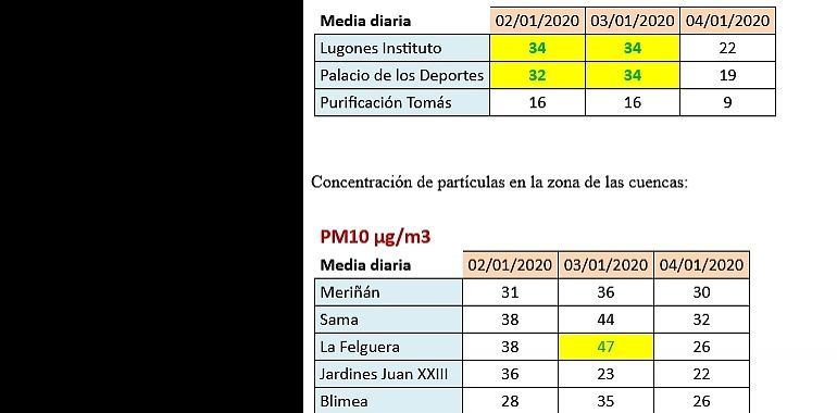 PM10 µg/m3 Media diaria 02/01/2020 03/01/2020 04/01/2020 Meriñán 31 36 30 Sama 38 44 32 La Felguera 38 47 26 Jardines Juan XXIII 36 23 22 Blimea 28 35 26