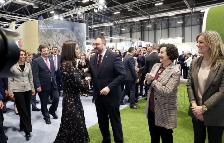 FOTO portada: la ministra de Industria, Comercio y Turismo, Reyes Maroto; el presidente del Principado de Asturias, Adrián Barbón; la consejera de Cultura, Política Llingüística y Turismo, Berta Piñán; la reina Letizia, y la viceconsejera de Turismo, Graciela Blanco.