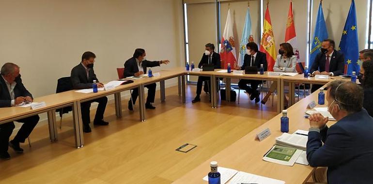Pie de foto: de izquierda a derecha, el secretario ejecutivo de UPA, Aurelio González del Río, el secretario general de COAG, Miguel Blanco, y el presidente nacional de ASAJA; el consejero de Medio Rural y Cohesión Territorial, Alejandro Calvo,; el consejero de Fomento y Medio Ambiente de Castilla y León, Juan Carlos Suárez-Quiñones; la consejera de Medio Ambiente, Territorio y Vivienda de Galicia, Ángeles Vázquez, y el consejero de Desarrollo Rural, Ganadería, Pesca, Alimentación y Medio Ambiente de Cantabria, Guillermo Blanco, y directivos de las consejerías.