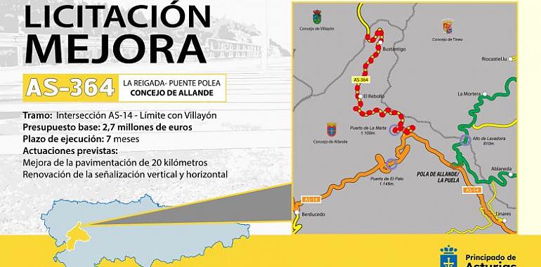 El Gobierno de Asturias ha sacado a licitación las obras de mejora de los primeros 20 kilómetros de la carretera AS-364 (La Reigada-Puente Polea), en el concejo de Allande. La actuación, que cuenta con un plazo de ejecución de siete meses, tiene un presupuesto base de 2.746.947 euros.