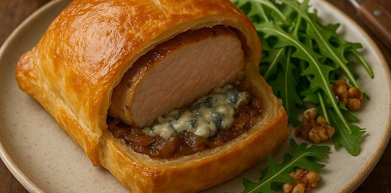 Ahora vien lo bueno: estira la masa de hojaldre, pon en el centro una cama de cebolla caramelizada, encima el solomillo, y por riba el cabrales desmenuzáu. Si te presta, un toque de mostaza va de cine.