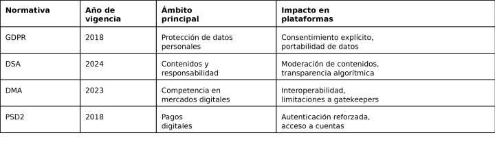 La Unión Europea ha construido un sistema regulatorio que aborda dimensiones múltiples del ecosistema digital. El Reglamento General de Protección de Datos (GDPR) establece estándares estrictos sobre tratamiento de información personal, mientras que la Ley de Servicios Digitales (DSA) y la Ley de Mercados Digitales (DMA) abordan aspectos de competencia y responsabilidad de intermediarios.
