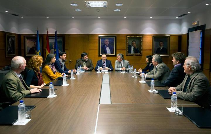 Oviedo.-Las fotografías recogen dos momentos de la reunión que ha mantenido esta tarde el consejero de Presidencia, Guillermo Martínez, con una delegación del Festival Intercéltico de Lorient, en Francia.