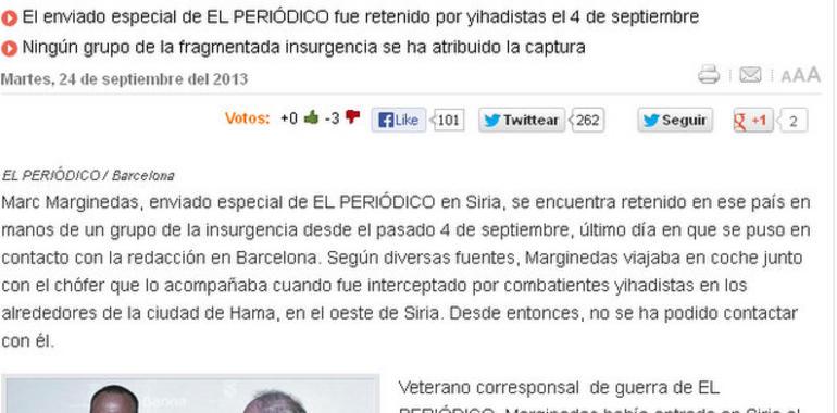 Según informa El Periódico en su edición digital, Marc Marginedas, enviado especial de EL PERIÓDICO en Siria, se encuentra retenido en ese país en manos de un grupo de la insurgencia desde el pasado 4 de septiembre, último día en que se puso en contacto con la redacción en Barcelona. Según diversas fuentes, Marginedas viajaba en coche junto con el chófer que lo acompañaba cuando fue interceptado por combatientes yihadistas en los alrededores de la ciudad de Hama, en el oeste de Siria. Desde entonces, no se ha podido contactar con él.