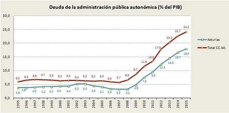 Según el Protocolo de Déficit Excesivo (PDE), la deuda de Asturias al final de 2015 era de 3.876 millones de euros, el valor más alto de la serie histórica, iniciada en 1995. A nivel nacional, la deuda en los tres últimos meses de 2015 ascendió a los 261,4 millones de euros, lo que supuso el 24,2 por ciento del PIB.