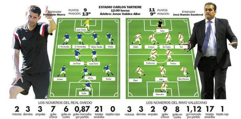 Pasan las jornadas, pero el juego del Oviedo no mejora, salvo en algunos momentos puntuales. Fernando Hierro sigue empeñado en que su equipo tenga el balón, pero cuando lo tiene, los azules no están cómodos: los pivotes se quedan sin ideas, no hay fluidez en el juego y el equipo no tiene profundidad. Y, para colmo, el calendario no da tregua. El Real Oviedo afronta mañana otro exigente partido en el Carlos Tartiere frente al Rayo Vallecano, uno de los equipos más fuertes de la categoría, y candidato al ascenso tras bajar a Segunda la pasada temporada. El Rayo arrancó mal la Liga con dos derrotas en los tres primeros encuentros, pero parece haber mejorado en las últimas jornadas. El equipo que dirige José Ramón Sandoval llega ‘lanzado’ al Carlos Tartiere tras vencer por tres goles a cero al Cádiz el pasado fin de semana, y encadenar tres partidos sin perder, pero también con ganas de ‘aprobar’ su principal asignatura pendiente esta campaña: ganar a domicilio. El Rayo ha sumado diez de los once puntos que tiene en Vallecas, donde todavía no ha encajado ni un gol, pero solo ha conseguido un punto como visitante (empató en el campo del Reus hace quince días). El Rayo cuenta, además, con ocho bajas. José Ramón Sandoval no podrá contar con el ex oviedista Diego Aguirre, Dorado, Mojica, Baena, Iñiguez, Embarba y Javi Guerra, todos lesionados; ni con el guineano Lass, convocado con su selección. Las ausencias más importantes son las de Embarba y Javi Guerra, titulares indiscutibles en el esquema de Sandoval, que estarán entre cuatro y seis semanas de baja por una rotura en el bíceps femoral. Pese a las bajas, el Rayo Vallecano cuenta con jugadores peligrosos que pondrán a prueba al equipo de Fernando Hierro. El guardameta Toño y el central Amaya son los dos pilares indiscutibles del Rayo de Sandoval, y los únicos que esta temporada han disputado todos los minutos. El veterano portero es, por ahora, uno de los menos goleados de la competición (ocho goles), y Amaya es uno de los centrales más contundentes de la categoría. También tendrá que tener especial cuidado el Oviedo con Trashorras, capitán del Rayo y ‘cerebro’ del equipo al que le gusta tocar el balón, y con el rumano Rat, otro de los líderes del conjunto madrileño, cuya especialidad es colocar centros perfectos desde la banda izquierda.