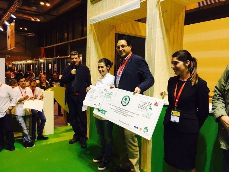 María Busta, propietaria de Casa Eutimio, además del prestigioso título recibía 1.000 euros en metálico. Sergio Blasco presidente de la IGP de Ternera Asturiana le hacía entrega del cheque.