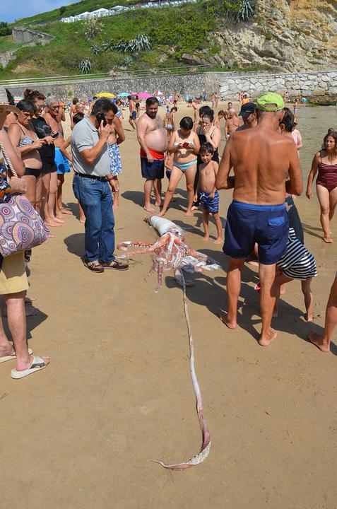 Llanes.-Alrededor de las doce del mediodía de hoy apareció flotando en aguas de la playa de El Sablón, en Llanes, un calamar gigante, que fue sacado a tierra por un bañista llanisco.
